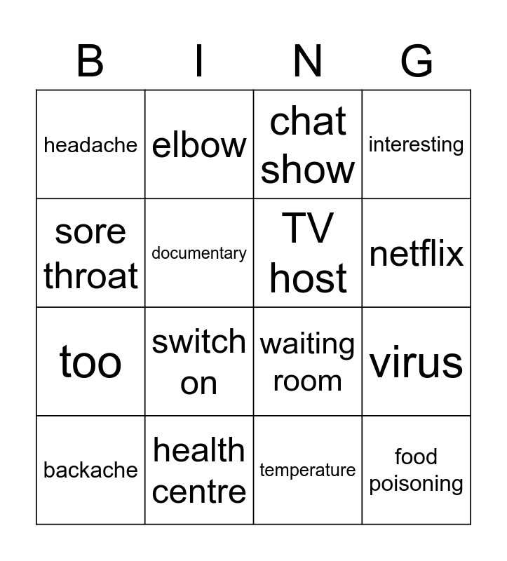 This bingo card has 27 words: Free!, enough, too, cookery program, documentary, chat show, elbow, food poisoning, health centre, heart attack, waiting room, interesting, interested, switch off, switch on, shoulder, TV host, netflix, pain killer, headache, temperature, stomachache, virus, backache, earache, sore throat and Chris Evans.