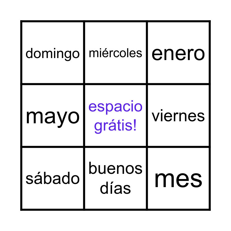 This bingo card has a free space and 22 words: lunes, martes, miércoles, jueves, viernes, sábado, domingo, enero, febrero, marzo, abril, mayo, junio, julio, agosto, septiembre, noviembre, diciembre, fin de semana, mes, buenos días and buenas tardes.