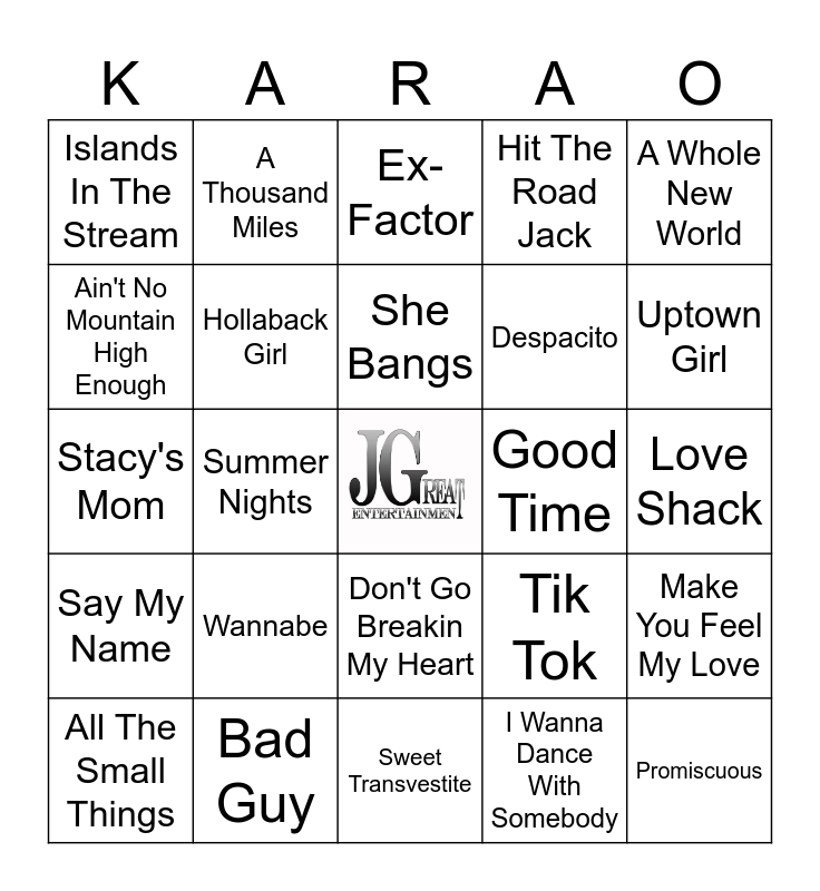 This bingo card has a free space and 64 words: Mr. BrightSide, Don't Stop Believing, Oops I Did It Again, Make You Feel My Love, Just The Way You Are, Someone Like You, A Thousand Miles, Unwritten, She Bangs, My Boo, Don't Go Breakin My Heart, Stay, Love Shack, A Whole New World, Beauty And The Beast, Ain't No Mountain High Enough, Summer Nights, Islands In The Stream, Savage, Despacito, Wannabe, Say My Name, Hit The Road Jack, Stayin Alive, Sweet Caroline, Sexual Healing, This Is How We Do It, Wide Open Spaces, Hit Me Baby One More Time, Party In The USA, Drops Of Jupiter, Let It Go, How Far I'll Go, Thank You, Next, Uptown Girl, All The Small Things, Fergalicious, I Wanna Dance With Somebody, Valerie, Hollaback Girl, Stacy's Mom, Good Time, Big Girls Don't Cry, Buttons, My Humps, Promiscuous, Bad Guy, Somebody That I Used To Know, Tik Tok, You Never Even Called Me By My Name, Kill Bill, Regulate, Sweet Transvestite, Careless Whisper, American Boy, You Belong With Me, Ex-Factor, Need You Now, All The Small Things, Love On Top, Rockabye, Espresso, Beautiful Things and Lose Control.