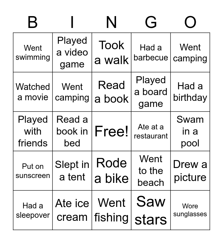 This bingo card has a free space and 24 words: Slept in a tent, Ate ice cream, Read a book, Had a sleepover, Went camping, Went swimming, Watched a movie, Played a video game, Ate at a restaurant, Rode a bike, Played a board game, Played with friends, Went to the beach, Drew a picture, Went camping, Saw stars, Swam in a pool, Took a walk, Had a birthday, Read a book in bed, Wore sunglasses, Put on sunscreen, Had a barbecue and Went fishing.