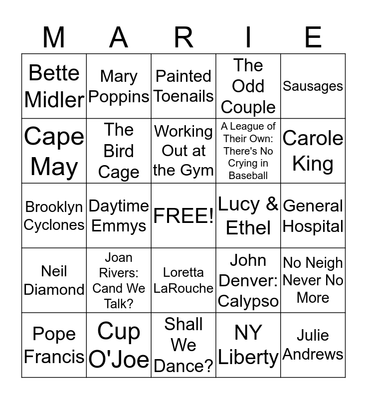 This bingo card has a free space and 24 words: Joan Rivers: Cand We Talk?, Cup O'Joe, Working Out at the Gym, Pope Francis, Sausages, Bette Midler, Cape May, Mary Poppins, Lucy & Ethel, Loretta LaRouche, A League of Their Own: There's No Crying in Baseball, Brooklyn Cyclones, John Denver: Calypso, No Neigh Never No More, The Bird Cage, NY Liberty, General Hospital, Painted Toenails, Carole King, Daytime Emmys, Julie Andrews, Neil Diamond, The Odd Couple and Shall We Dance?.