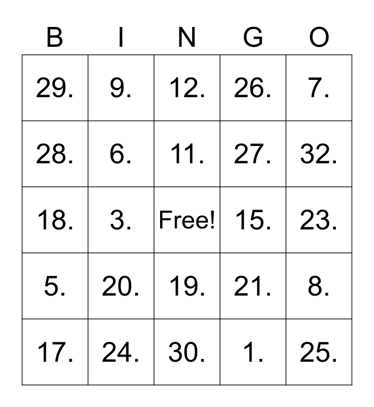 This bingo card has a free space and 32 words: 1., 2., 3., 4., 5., 6., 7., 8., 9., 10., 11., 12., 13., 14., 15., 16., 17., 18., 19., 20., 21., 22., 23., 24., 25., 26., 27., 28., 29., 30., 31. and 32..