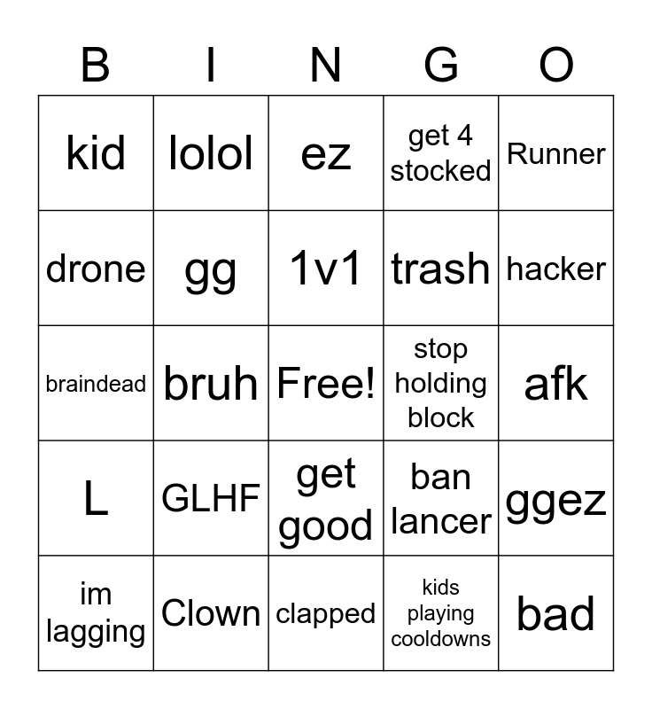 This bingo card has a free space and 24 words: GLHF, Clown, 1v1, im lagging, Runner, kid, drone, lolol, stop holding block, get good, trash, braindead, ban lancer, ggez, gg, kids playing cooldowns, afk, ez, hacker, bruh, bad, L, get 4 stocked and clapped.