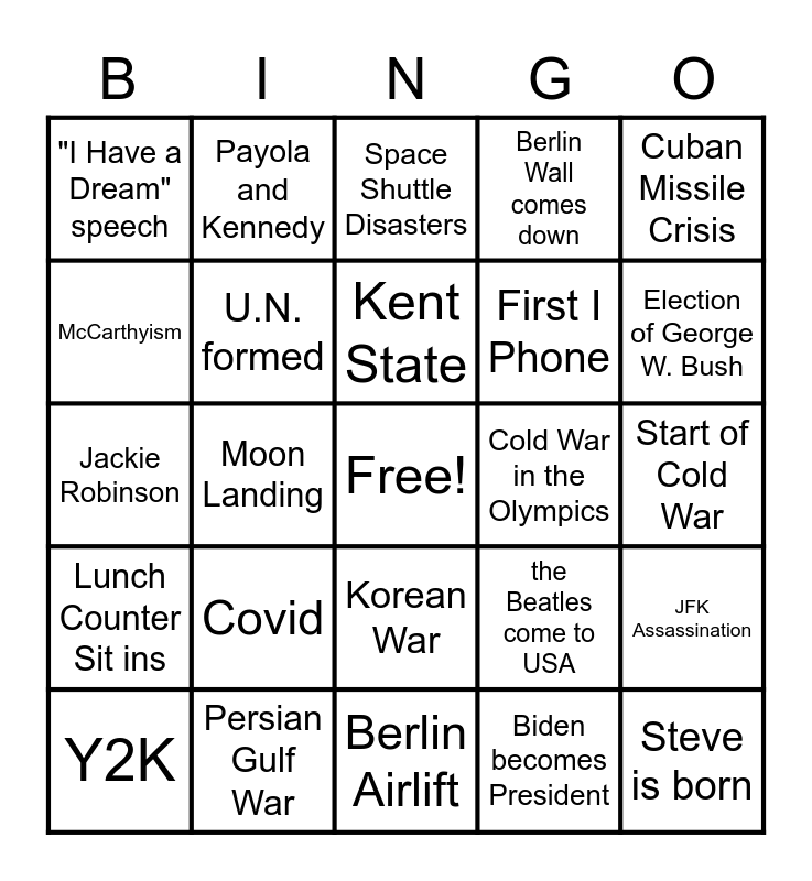 This bingo card has 40 words: Watergate scandal, Jackie Robinson, Sputnik, U.N. formed, Persian Gulf War, Korean War, Kent State, Berlin Wall constructed, Cuban Missile Crisis, Lunch Counter Sit ins, Moon Landing, Berlin Wall comes down, Free!, Start of Cold War, Cold War in the Olympics, Covid, Desegregation of the Military, "I Have a Dream" speech, Obama Elected President, Space Shuttle Disasters, JFK Assassination, Biden becomes President, First I Phone, McCarthyism, 1st day of School with Gonzo, U.S.S Cole bombed, Elvis becomes popular, Star Wars debuts, Steve is born, Iranian Hostage Crisis, Mr. Sawatzky is born, Y2K, Election of Bill Clinton, the Beatles come to USA, Election of George W. Bush, Berlin Airlift, Bay of Pigs Invasion, Marilyn Monroe, Payola and Kennedy and Belgians in the Congo.