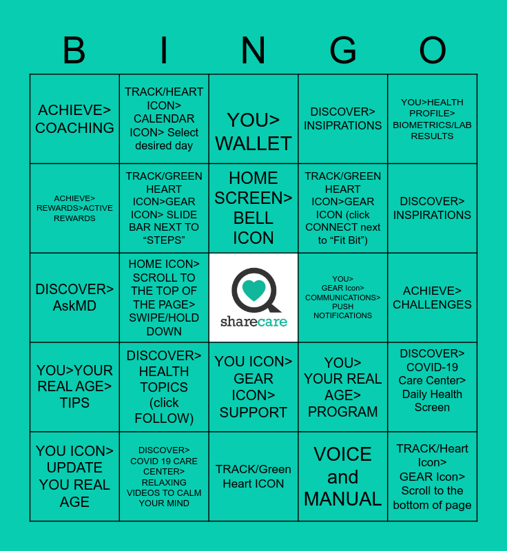 This bingo card has a free space and 24 words: DISCOVER> HEALTH TOPICS (click FOLLOW), DISCOVER> COVID 19 CARE CENTER> RELAXING VIDEOS TO CALM YOUR MIND, HOME SCREEN> BELL ICON, YOU ICON> UPDATE YOU REAL AGE, YOU>HEALTH PROFILE> BIOMETRICS/LAB RESULTS, ACHIEVE> COACHING, ACHIEVE> REWARDS>ACTIVE REWARDS, TRACK/HEART ICON> CALENDAR ICON> Select desired day, YOU> GEAR Icon> COMMUNICATIONS> PUSH NOTIFICATIONS, YOU ICON> GEAR ICON> SUPPORT, TRACK/GREEN HEART ICON>GEAR ICON (click CONNECT next to “Fit Bit”), DISCOVER> AskMD, YOU> YOUR REAL AGE> PROGRAM, DISCOVER> COVID-19 Care Center> Daily Health Screen, TRACK/GREEN HEART ICON>GEAR ICON> SLIDE BAR NEXT TO “STEPS”, VOICE and MANUAL, ACHIEVE> CHALLENGES, YOU> WALLET, DISCOVER> INSPIRATIONS, HOME ICON> SCROLL TO THE TOP OF THE PAGE> SWIPE/HOLD DOWN, TRACK/Heart Icon> GEAR Icon> Scroll to the bottom of page, YOU>YOUR REAL AGE> TIPS, DISCOVER> INSIPRATIONS and TRACK/Green Heart ICON.