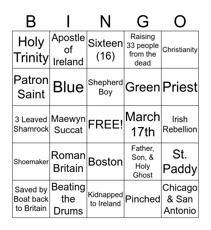 This bingo card has a free space and 25 words: Roman Britain, Kidnapped to Ireland, Shepherd Boy, Saved by Boat back to Britain, Christianity, Holy Trinity, Patron Saint, Apostle of Ireland, March 17th, Boston, Green, 3 Leaved Shamrock, Father, Son, & Holy Ghost, St. Paddy, Blue, Wearing of the Green, Irish Rebellion, Sixteen (16), Priest, Maewyn Succat, Chicago & San Antonio, Beating the Drums, Shoemaker, Raising 33 people from the dead and Pinched.
