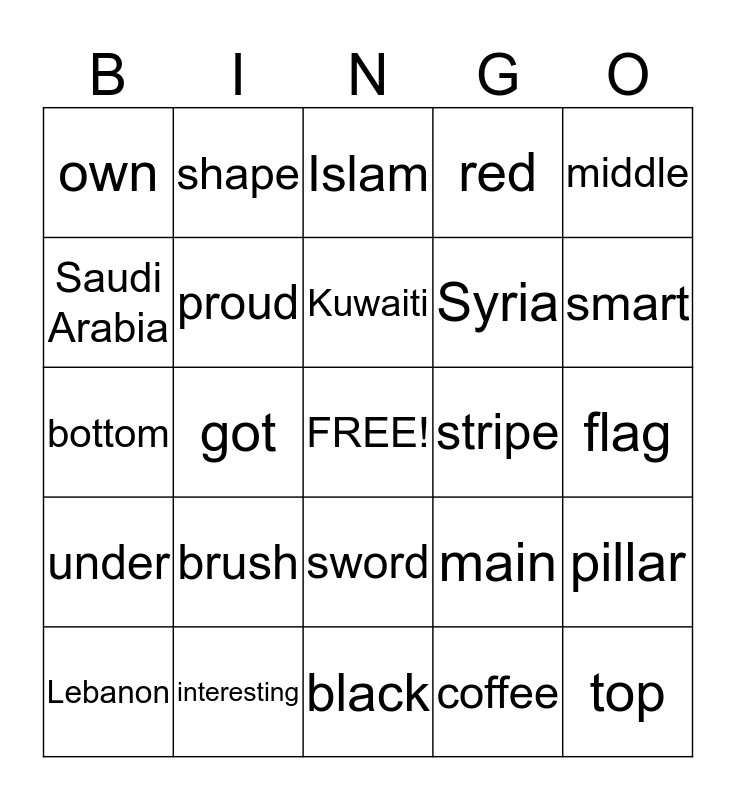 This bingo card has a free space and 24 words: brush, interesting, Kuwaiti, Lebanon, middle, own, Saudi Arabia, shape, stripe, sword, Syria, bottom, main, pillar, proud, coffee, flag, Islam, smart, got, top, under, red and black.
