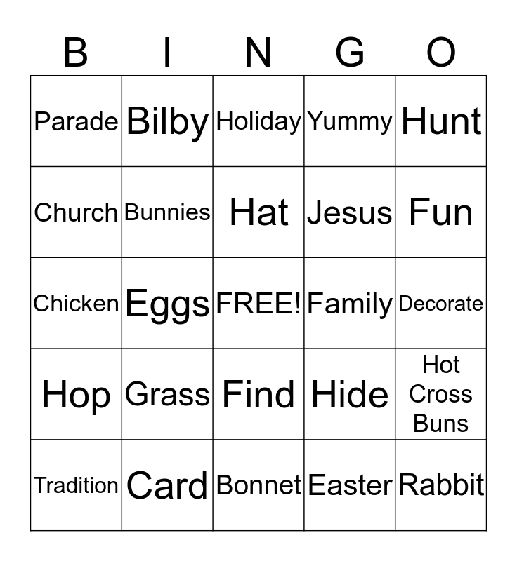 This bingo card has a free space and 32 words: Easter, Burrow, Eggs, Chocolate, Hop, Bunnies, Hunt, Hot Cross Buns, Bilby, Happy, Hat, Holiday, Good Friday, Easter Sunday, Family, Hide, Tradition, Chicken, Find, Grass, Hide, Delicious, Decorate, Card, Rabbit, Yummy, Jesus, Church, Parade, Bonnet, Celebrate and Fun.