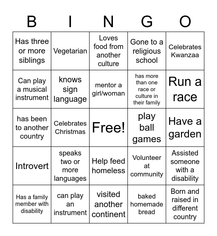 This bingo card has a free space and 24 words: speaks two or more languages, can play an instrument, mentor a girl/woman, Has a family member with disability, Celebrates Kwanzaa, Has three or more siblings, Can play a musical instrument, Vegetarian, play ball games, Help feed homeless, has more than one race or culture in their family, has been to another country, Volunteer at community, Assisted someone with a disability, knows sign language, baked homemade bread, Have a garden, Loves food from another culture, Run a race, Celebrates Christmas, Born and raised in different country, Introvert, Gone to a religious school and visited another continent.