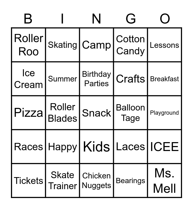 This bingo card has 35 words: Sparkles, Arcade, Wheels, Summer, Kids, Cotton Candy, Ice Cream, Smyrna, Birthday Parties, Prizes, Pizza, Lessons, Free Skate!, Friends, Roller Roo, Balloon Tage, Bearings, Roller Blades, Races, Snack, Laces, Tickets, ICEE, Skate Trainer, Camp, Breakfast, Ms. Mell, Toe Stopper, Crafts, Playground, Cool, Chicken Nuggets, Happy, Skating and Movies.