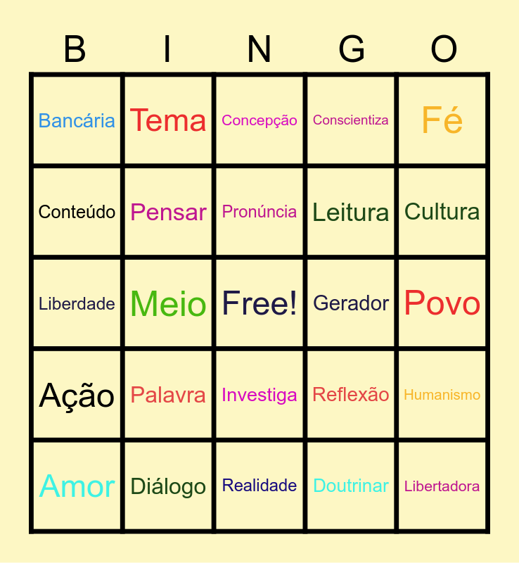 This bingo card has a free space and 24 words: Palavra, Diálogo, Pronúncia, Amor, Fé, Bancária, Conteúdo, Tema, Gerador, Investiga, Leitura, Liberdade, Reflexão, Humanismo, Pensar, Doutrinar, Povo, Concepção, Cultura, Meio, Libertadora, Ação, Conscientiza and Realidade.