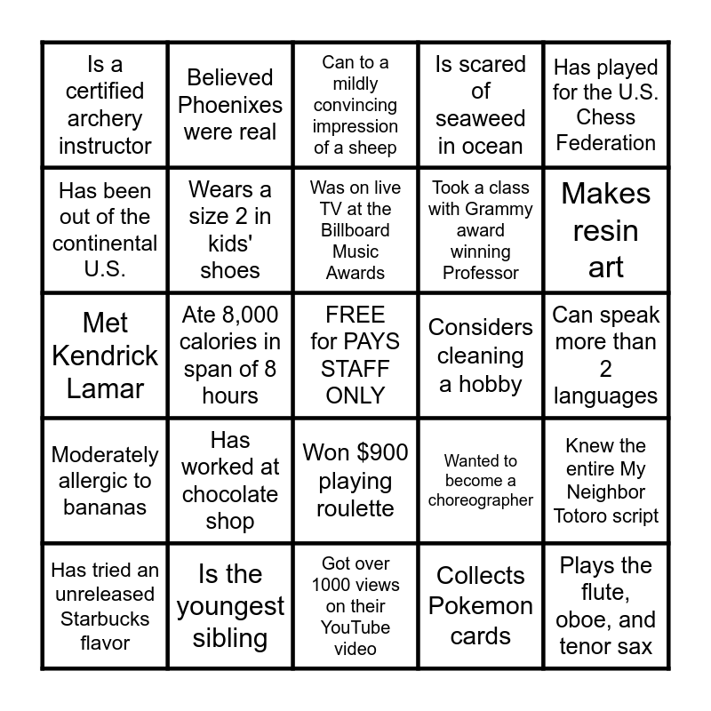 This bingo card has a free space and 24 words: Has worked at chocolate shop, Is the youngest sibling, Was on live TV at the Billboard Music Awards, Has tried an unreleased Starbucks flavor, Has played for the U.S. Chess Federation, Is a certified archery instructor, Has been out of the continental U.S., Believed Phoenixes were real, Considers cleaning a hobby, Won $900 playing roulette, Took a class with Grammy award winning Professor, Met Kendrick Lamar, Wanted to become a choreographer, Knew the entire My Neighbor Totoro script, Wears a size 2 in kids' shoes, Collects Pokemon cards, Can speak more than 2 languages, Can to a mildly convincing impression of a sheep, Makes resin art, Ate 8,000 calories in span of 8 hours, Plays the flute, oboe, and tenor sax, Moderately allergic to bananas, Is scared of seaweed in ocean and Got over 1000 views on their YouTube video.