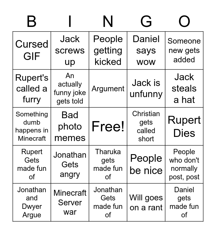 This bingo card has a free space and 33 words: Ryan gets made fun of, Someone's stuff gets stolen, Bad photo memes, Someone gets sued, Rupert Gets made fun of, An actually funny joke gets told, Someone new gets added, Jonathan and Dwyer Argue, Jack screws up, Someone gets a detention, Argument, People getting kicked, Chat Bullshit (free space), Furries, Christian gets called short, Jack steals a hat, Minecraft Server war, Something dumb happens in Minecraft, Jonathan Gets angry, People be nice, Tharuka gets made fun of, Ryan gets called short, Cursed GIF, Rupert Dies, Jonathan Gets made fun of, Daniel gets made fun of, Daniel says wow, Jack is unfunny, Rupert's called a furry, People who don't normally post, post, Ryan (S) says wow, Will goes on a rant and Ryan reacts with a thumbs up.