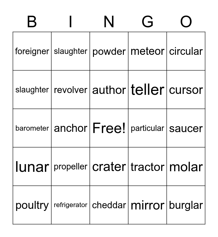 This bingo card has a free space and 24 words: propeller, refrigerator, author, poultry, circular, foreigner, slaughter, slaughter, particular, crater, teller, barometer, tractor, molar, revolver, mirror, saucer, powder, cursor, anchor, burglar, lunar, meteor and cheddar.