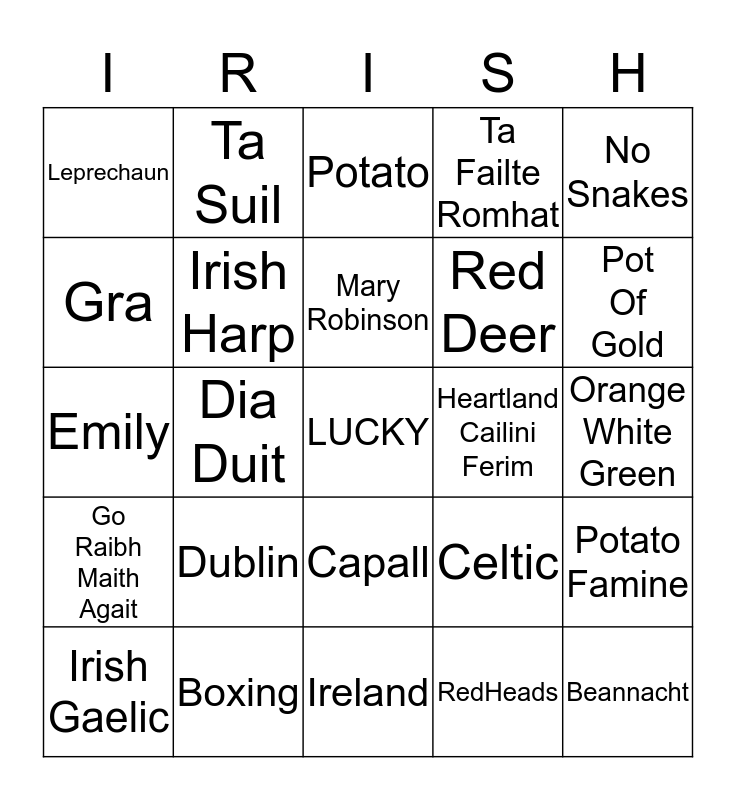 This bingo card has a free space and 24 words: Dublin, Boxing, Mary Robinson, Irish Gaelic, No Snakes, Leprechaun, Gra, Ta Suil, Heartland Cailini Ferim, Capall, Red Deer, Emily, Celtic, Potato Famine, Irish Harp, RedHeads, Orange White Green, Potato, Pot Of Gold, Dia Duit, Beannacht, Go Raibh Maith Agait, Ta Failte Romhat and Ireland.