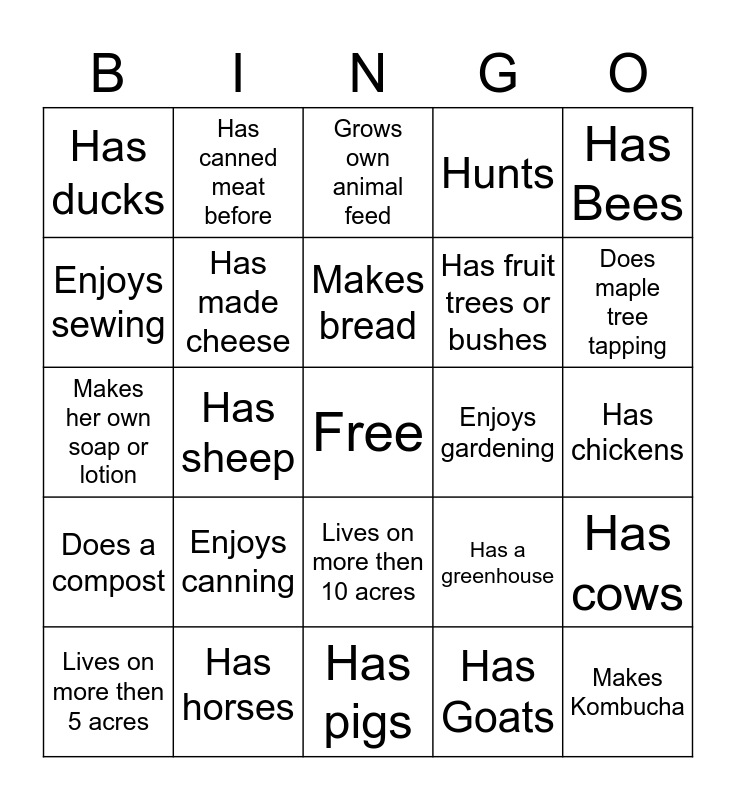 This bingo card has a free space and 24 words: Enjoys canning, Has horses, Makes bread, Lives on more then 5 acres, Has Bees, Has ducks, Enjoys sewing, Has canned meat before, Enjoys gardening, Lives on more then 10 acres, Has fruit trees or bushes, Makes her own soap or lotion, Has a greenhouse, Has cows, Has made cheese, Has Goats, Has chickens, Grows own animal feed, Does maple tree tapping, Has sheep, Makes Kombucha, Does a compost, Hunts and Has pigs.