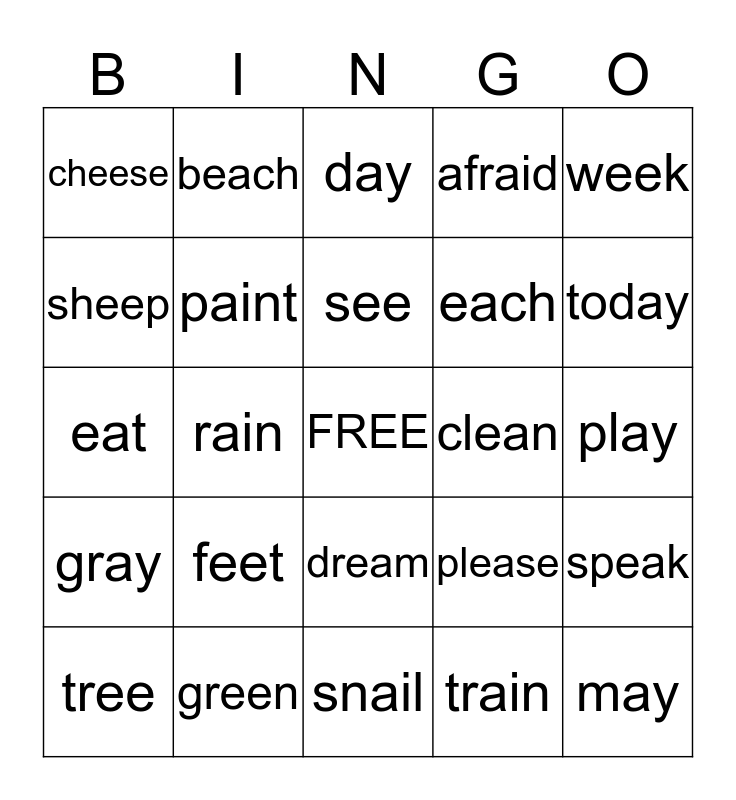This bingo card has a free space and 24 words: feet, green, see, tree, week, cheese, sheep, beach, clean, dream, each, eat, please, speak, paint, train, play, day, today, rain, may, gray, afraid and snail.