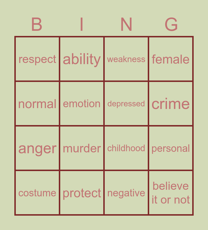 This bingo card has 17 words: Free!, costume, ability, weakness, personal, normal, murder, depressed, crime, anger, protect, childhood, female, respect, emotion, negative and believe it or not.