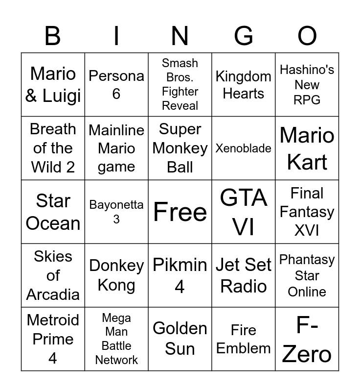 This bingo card has a free space and 24 words: Donkey Kong, Mega Man Battle Network, Super Monkey Ball, Metroid Prime 4, Hashino's New RPG, Mario & Luigi, Breath of the Wild 2, Persona 6, GTA VI, Pikmin 4, Xenoblade, Star Ocean, Jet Set Radio, Phantasy Star Online, Mainline Mario game, Fire Emblem, Final Fantasy XVI, Smash Bros. Fighter Reveal, Mario Kart, Bayonetta 3, F-Zero, Skies of Arcadia, Kingdom Hearts and Golden Sun.