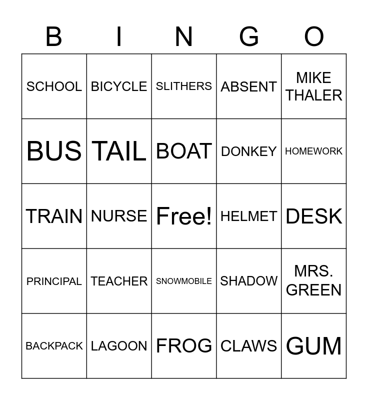 This bingo card has a free space and 24 words: TEACHER, LAGOON, BOAT, BACKPACK, MIKE THALER, SCHOOL, BUS, BICYCLE, HELMET, SNOWMOBILE, DONKEY, TRAIN, SHADOW, MRS. GREEN, TAIL, CLAWS, DESK, SLITHERS, HOMEWORK, NURSE, GUM, PRINCIPAL, ABSENT and FROG.