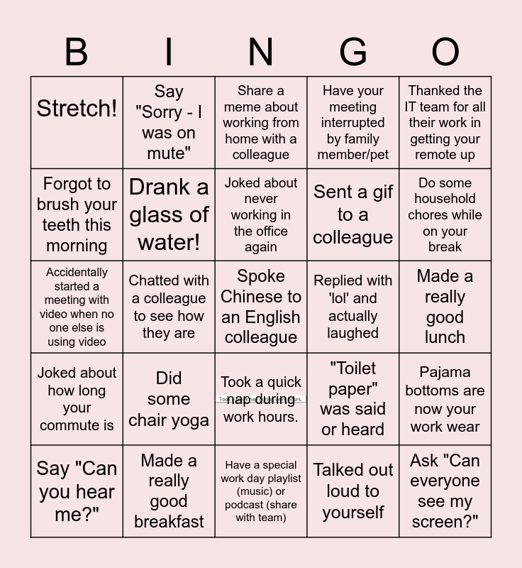 This bingo card has 1 images, a free space and 25 words: Say "Can you hear me?", Did some chair yoga, Joked about never working in the office again, Talked out loud to yourself, Do some household chores while on your break, Stretch!, Say "Sorry - I was on mute", Share a meme about working from home with a colleague, Sent a gif to a colleague, Pajama bottoms are now your work wear, Accidentally started a meeting with video when no one else is using video, Drank a glass of water!, "Toilet paper" was said or heard, Ask "Can everyone see my screen?", Forgot to brush your teeth this morning, Made a really good breakfast, Have a special work day playlist (music) or podcast (share with team), Have your meeting interrupted by family member/pet, Made a really good lunch, Joked about how long your commute is, Chatted with a colleague to see how they are, Took a quick nap during work hours., Replied with 'lol' and actually laughed, Thanked the IT team for all their work in getting your remote up and Give a coworker a shout out in huddle.