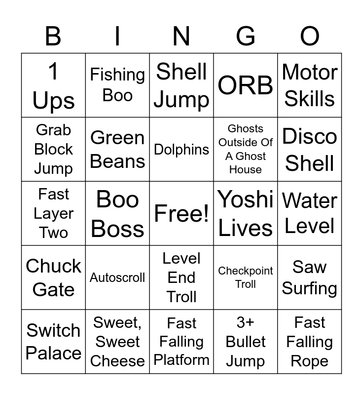 This bingo card has a free space and 33 words: Hidden Block, Secret Room, Boo Boss, Reznor, Chuck Gate, Green Beans, Motor Skills, Switch Palace, Fishing Boo, Spin Jump Line, Dolphins, Shell Jump, Double Shell Jump, Yoshi Dies, Yoshi Lives, Disco Shell, Sweet, Sweet Cheese, Fast Layer Two, Autoscroll, Checkpoint Troll, Level End Troll, Up Pipe, 1 Ups, Water Level, Fast Falling Platform, Fast Falling Rope, ORB, Ghosts Outside Of A Ghost House, Grab Block Jump, Saw Surfing, Non-Downward Thwomp, 3+ Bullet Jump and Fish Out Of Water.
