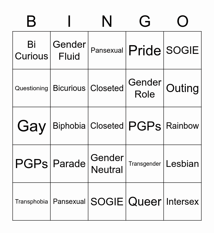 This bingo card has 25 words: PGPs, Pansexual, Closeted, Queer, SOGIE, Bi Curious, Gender Fluid, Pansexual, PGPs, Lesbian, Questioning, Bicurious, SOGIE, Transgender, Outing, Transphobia, Biphobia, Closeted, Gender Role, Rainbow, Gay, Parade, Gender Neutral, Pride and Intersex.
