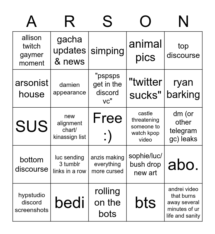 This bingo card has a free space and 24 words: hypstudio discord screenshots, luc sending 3 tumblr links in a row, "pspsps get in the discord vc", bts, top discourse, allison twitch gaymer moment, gacha updates & news, simping, castle threatening someone to watch kpop video, dm (or other telegram gc) leaks, SUS, damien appearance, sophie/luc/ bush drop new art, abo., arsonist house, bedi, rolling on the bots, animal pics, ryan barking, bottom discourse, new alignment chart/ kinassign list, anzis making everything more cursed, "twitter sucks" and andrei video that burns away several minutes of ur life and sanity.