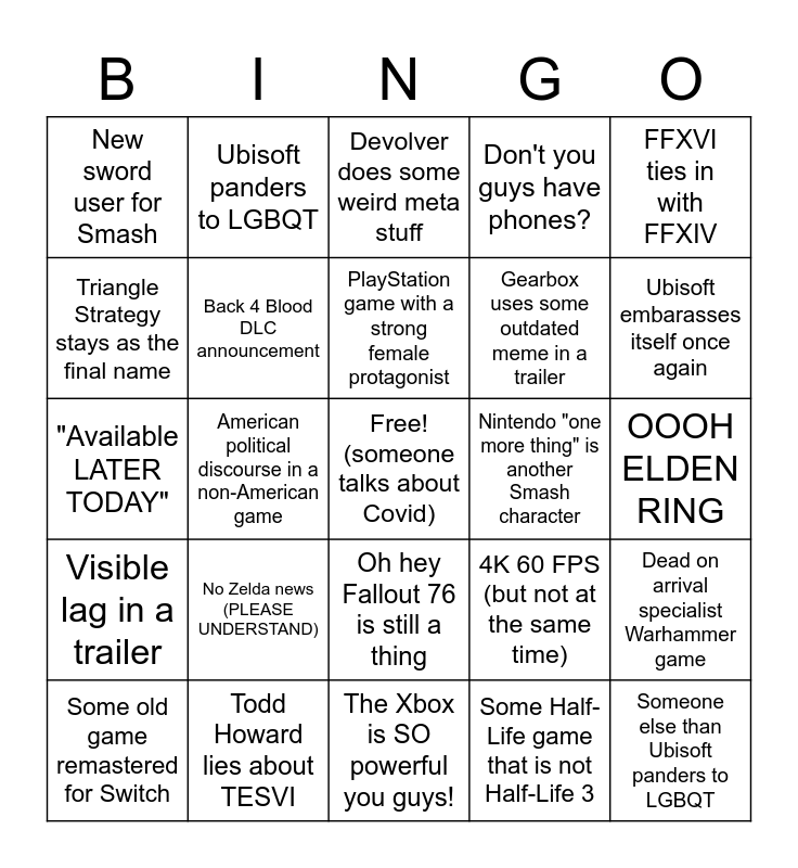 This bingo card has a free space and 24 words: No Zelda news (PLEASE UNDERSTAND), Todd Howard lies about TESVI, PlayStation game with a strong female protagonist, Some old game remastered for Switch, FFXVI ties in with FFXIV, New sword user for Smash, Triangle Strategy stays as the final name, Ubisoft panders to LGBQT, Nintendo "one more thing" is another Smash character, Oh hey Fallout 76 is still a thing, Gearbox uses some outdated meme in a trailer, "Available LATER TODAY", 4K 60 FPS (but not at the same time), Dead on arrival specialist Warhammer game, Back 4 Blood DLC announcement, Some Half-Life game that is not Half-Life 3, OOOH ELDEN RING, Devolver does some weird meta stuff, Ubisoft embarasses itself once again, American political discourse in a non-American game, Someone else than Ubisoft panders to LGBQT, Visible lag in a trailer, Don't you guys have phones? and The Xbox is SO powerful you guys!.