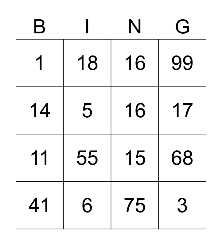 This bingo card has 25 words: 3, 8, 17, 9, 14, 1, 5, 18, 6, 20, 11, 15, 12, 10, 16, 4, 75, 16, 55, 68, 41, 80, 3, 99 and 78.