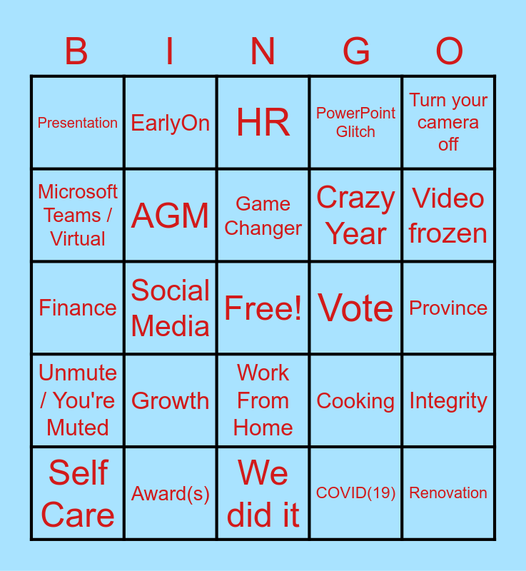 This bingo card has a free space and 34 words: Emergency, Event, Child Care, Face to Face, Province, Microsoft Teams / Virtual, AGM, We did it, Crazy Year, Renovation, Finance, EarlyOn, COVID(19), Doug Ford/Ford Government, Unmute / You're Muted, Social Media, Work From Home, Vote, Integrity, Self Care, Award(s), Family, PowerPoint Glitch, Video frozen, Screen, Growth, HR, Stop Sharing, Turn your camera off, Presentation, Project, Game Changer, Cooking and Popcorn.