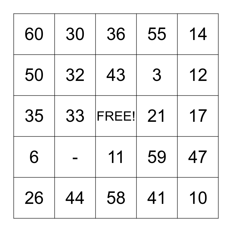 This bingo card has a free space and 25 words: -, 58, 43, 26, 14, 60, 50, 30, 21, 11, 3, 35, 59, 47, 32, 24, 17, 36, 12, 33, 10, 44, 6, 55 and 41.