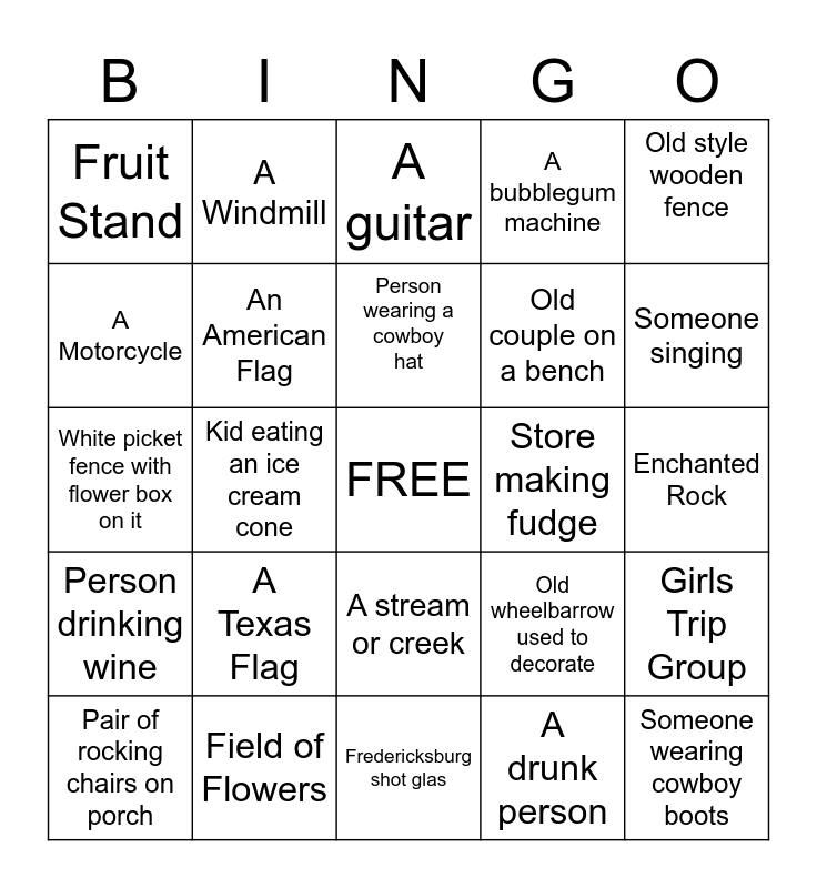 This bingo card has a free space and 24 words: A Texas Flag, Field of Flowers, Person wearing a cowboy hat, Pair of rocking chairs on porch, Old style wooden fence, Fruit Stand, A Motorcycle, A Windmill, Store making fudge, A stream or creek, Old couple on a bench, White picket fence with flower box on it, Old wheelbarrow used to decorate, Girls Trip Group, An American Flag, A drunk person, Enchanted Rock, A guitar, Someone singing, Kid eating an ice cream cone, Someone wearing cowboy boots, Person drinking wine, A bubblegum machine and Fredericksburg shot glas.