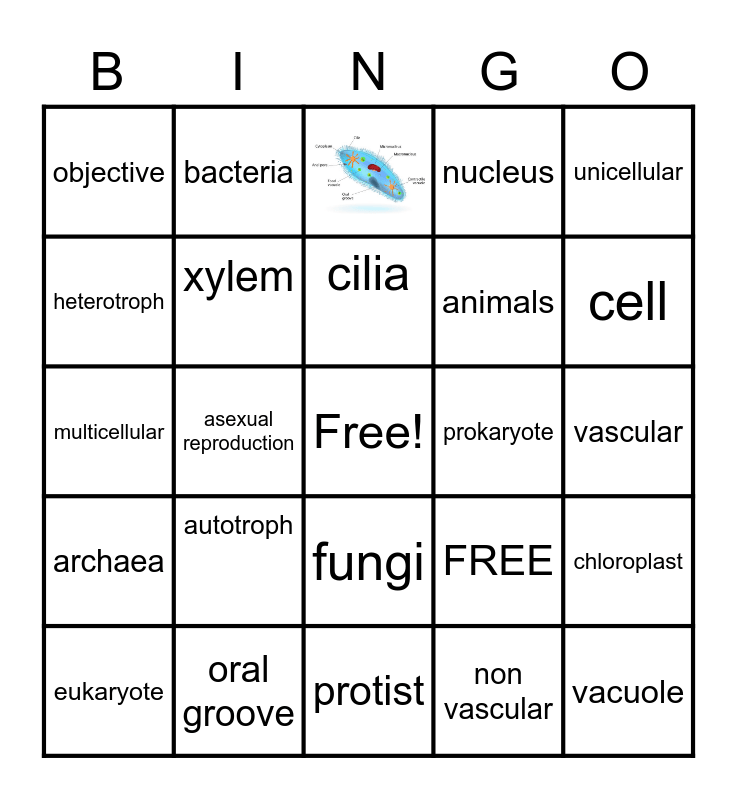 This bingo card has 1 images, a free space and 24 words: autotroph, protist, cilia, eukaryote, unicellular, objective, heterotroph, bacteria, prokaryote, fungi, animals, multicellular, FREE, chloroplast, xylem, phloem, vascular, cell, asexual reproduction, vacuole, oral groove, archaea, nucleus and non vascular.