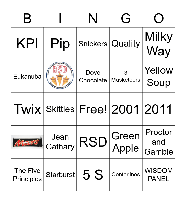 This bingo card has 2 images, a free space and 24 words: The Five Principles, Jean Cathary, 5 S, M&Ms, Yellow Soup, KPI, Pip, Snickers, 2001, Proctor and Gamble, Eukanuba, Skittles, Centerlines, WISDOM PANEL, Twix, Starburst, Dove Chocolate, Green Apple, Milky Way, RSD, 3 Musketeers, 2011, Quality and Nutrition Academy.
