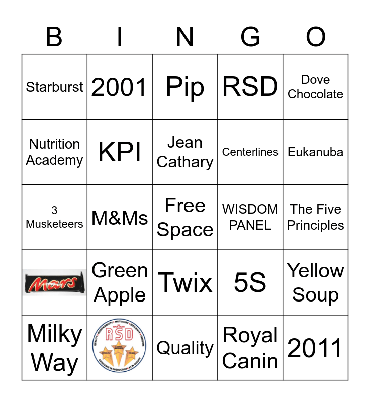 This bingo card has 2 images, a free space and 22 words: Milky Way, Green Apple, Jean Cathary, Royal Canin, Dove Chocolate, Starburst, 2001, Pip, WISDOM PANEL, The Five Principles, 3 Musketeers, KPI, 5S, Yellow Soup, Nutrition Academy, Quality, RSD, Eukanuba, M&Ms, Twix, Centerlines and 2011.