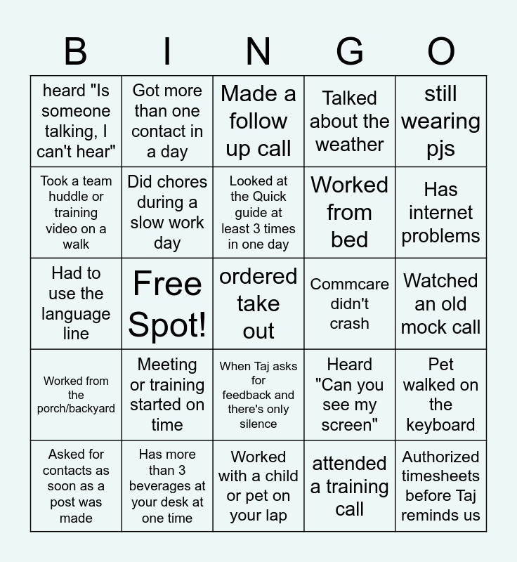 This bingo card has 25 words: Worked from the porch/backyard, Has more than 3 beverages at your desk at one time, ordered take out, attended a training call, still wearing pjs, heard "Is someone talking, I can't hear", Got more than one contact in a day, Made a follow up call, Commcare didn't crash, Pet walked on the keyboard, Took a team huddle or training video on a walk, Did chores during a slow work day, Worked with a child or pet on your lap, Heard "Can you see my screen", Has internet problems, Asked for contacts as soon as a post was made, Free Spot!, Looked at the Quick guide at least 3 times in one day, Worked from bed, Watched an old mock call, Had to use the language line, Meeting or training started on time, When Taj asks for feedback and there's only silence, Talked about the weather and Authorized timesheets before Taj reminds us.
