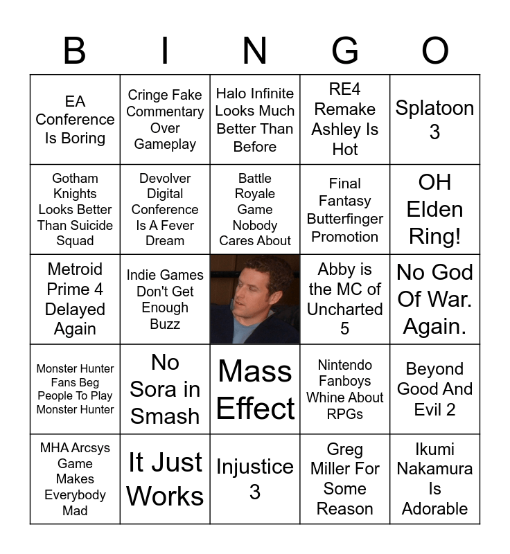 This bingo card has a free space and 24 words: No Sora in Smash, It Just Works, Battle Royale Game Nobody Cares About, MHA Arcsys Game Makes Everybody Mad, Splatoon 3, EA Conference Is Boring, Gotham Knights Looks Better Than Suicide Squad, Cringe Fake Commentary Over Gameplay, Abby is the MC of Uncharted 5, Mass Effect, Final Fantasy Butterfinger Promotion, Metroid Prime 4 Delayed Again, Nintendo Fanboys Whine About RPGs, Beyond Good And Evil 2, Devolver Digital Conference Is A Fever Dream, Greg Miller For Some Reason, No God Of War. Again., Halo Infinite Looks Much Better Than Before, OH Elden Ring!, Indie Games Don't Get Enough Buzz, Ikumi Nakamura Is Adorable, Monster Hunter Fans Beg People To Play Monster Hunter, RE4 Remake Ashley Is Hot and Injustice 3.
