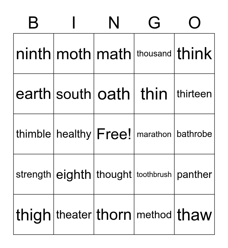 This bingo card has a free space and 27 words: toothbrush, bathroom, thin, thorn, earth, math, moth, strength, marathon, panther, thimble, thousand, thigh, theater, thirteen, something, south, oath, eighth, ninth, bathrobe, method, healthy, thaw, thought, think and nothing.