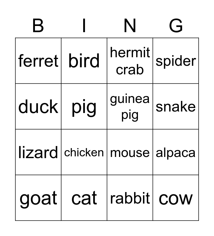 This bingo card has 21 words: cat, dog, bird, fish, rabbit, guinea pig, ferret, hermit crab, mouse, snake, lizard, spider, cow, horse, pig, sheep, goat, chicken, duck, alpaca and pet.