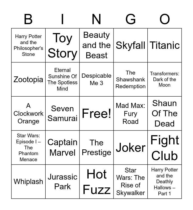This bingo card has a free space and 103 words: Avatar, Avengers: Endgame, Titanic, Star Wars: The Force Awakens, Avengers: Infinity War, Jurassic World, The Lion King, The Avengers, Furious 7, Frozen II, Avengers: Age of Ultron, Black Panther, Harry Potter and the Deathly Hallows – Part 2, Star Wars: The Last Jedi, Jurassic World: Fallen Kingdom, Frozen, Beauty and the Beast, Incredibles 2, The Fate of the Furious, Iron Man 3, Minions, Captain America: Civil War, Aquaman, The Lord of the Rings: The Return of the King, Spider-Man: Far From Home, Captain Marvel, Transformers: Dark of the Moon, Skyfall, Transformers: Age of Extinction, The Dark Knight Rises, Joker, Star Wars: The Rise of Skywalker, Toy Story 4, Toy Story 3, Pirates of the Caribbean: Dead Man's Chest, Rogue One: A Star Wars Story, Aladdin, Pirates of the Caribbean: On Stranger Tides, Despicable Me 3, Jurassic Park, Finding Dory, Star Wars: Episode I – The Phantom Menace, Alice in Wonderland, Zootopia, The Hobbit: An Unexpected Journey, Harry Potter and the Philosopher's Stone, The Dark Knight, Harry Potter and the Deathly Hallows – Part 1, Despicable Me 2, Gone with the Wind, Star Wars, The Sound of Music, E.T. the Extra-Terrestrial, The Ten Commandments, Doctor Zhivago, Arrival, Lost In Translation, The Princess Bride, The Terminator, The Prestige, Shaun Of The Dead, The Exorcist, Indiana Jones And The Last Crusade, Leon The Professional, Rocky, The Social Network, Spirited Away, Toy Story, A Clockwork Orange, Seven Samurai, Hot Fuzz, Singin' In The Rain, Ghostbusters, Memento, La La Land, Forrest Gump, Inglourious Basterds, Whiplash, The notebook, The Silence Of The Lambs, Interstellar, Gladiator, Eternal Sunshine Of The Spotless Mind, Saving Private Ryan, Mad Max: Fury Road, Guardians Of The Galaxy, Schindler's List, The Good, The Bad And The Ugly, Casablanca, The Matrix, 2001: A Space Odyssey, Inception, Fight Club, Alien, Jaws, Back To The Future, The Shawshank Redemption, The Godfather, Farewell My Concubine, Spring in a Small Town, Crouching Tiger, Hidden Dragon, The wandering earth and Harry Potter and the Goblet of fire.