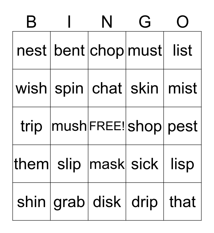 This bingo card has a free space and 24 words: slip, grab, chat, shin, list, nest, wish, bent, shop, mask, skin, trip, sick, lisp, spin, drip, pest, chop, mist, mush, that, them, must and disk.
