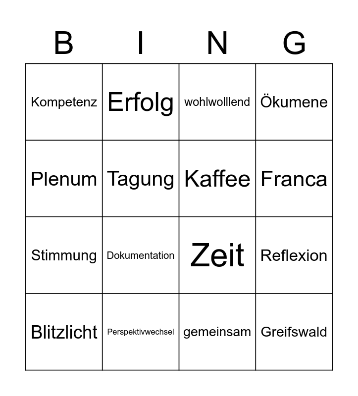 This bingo card has 16 words: Perspektivwechsel, Reflexion, wohlwolllend, Kompetenz, Stimmung, Erfolg, Zeit, gemeinsam, Plenum, Tagung, Blitzlicht, Ökumene, Dokumentation, Franca, Kaffee and Greifswald.