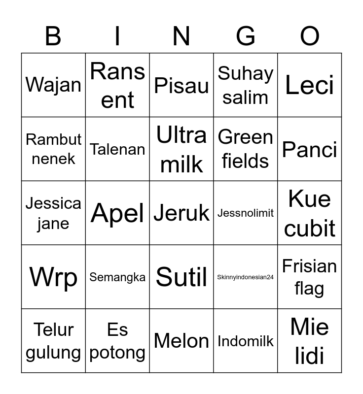 This bingo card has a free space and 24 words: Semangka, Es potong, Ultra milk, Telur gulung, Leci, Wajan, Rambut nenek, Rans ent, Jessnolimit, Sutil, Green fields, Jessica jane, Skinnyindonesian24, Frisian flag, Talenan, Indomilk, Kue cubit, Pisau, Panci, Apel, Mie lidi, Wrp, Suhay salim and Melon.