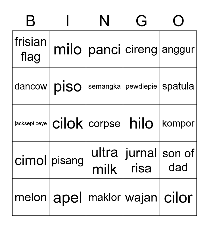 This bingo card has a free space and 24 words: pisang, apel, semangka, melon, anggur, frisian flag, dancow, milo, hilo, ultra milk, pewdiepie, jacksepticeye, jurnal risa, son of dad, piso, wajan, kompor, panci, spatula, cilok, cilor, cimol, cireng and maklor.