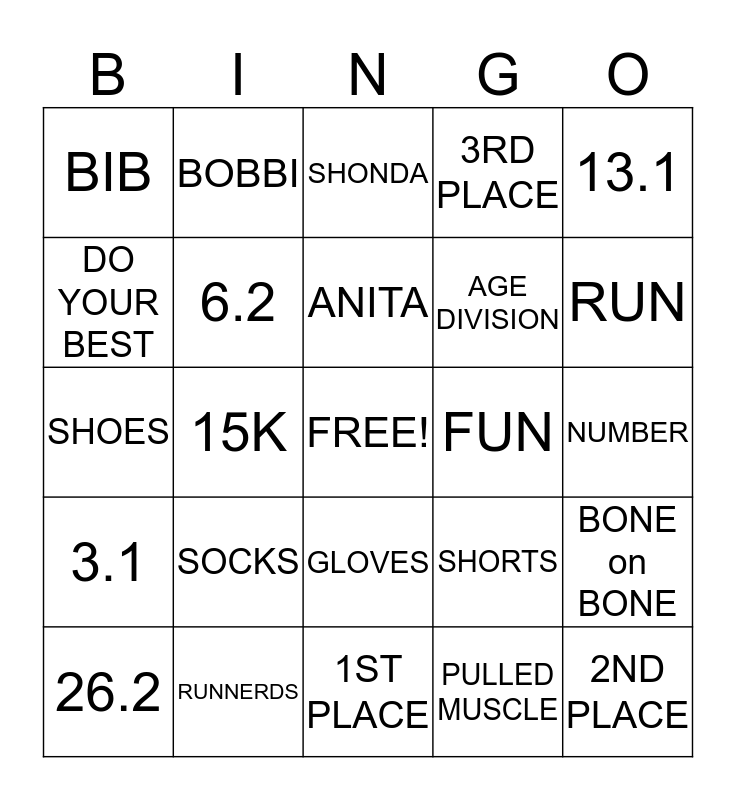 This bingo card has a free space and 33 words: 5K, 10K, 15K, 20K, 3.1, 6.2, 13.1, 26.2, BOBBI, MIKE, ANITA, SHONDA, SALLY, ANDREA, FUN, RUN, RUNNERDS, SHOES, SOCKS, SHORTS, GLOVES, SUN GLASSES, BIB, NUMBER, 1ST PLACE, 2ND PLACE, 3RD PLACE, AGE DIVISION, DO YOUR BEST, BONE on BONE, PLANTER FASCIITIS, PULLED MUSCLE and MANISCUS.