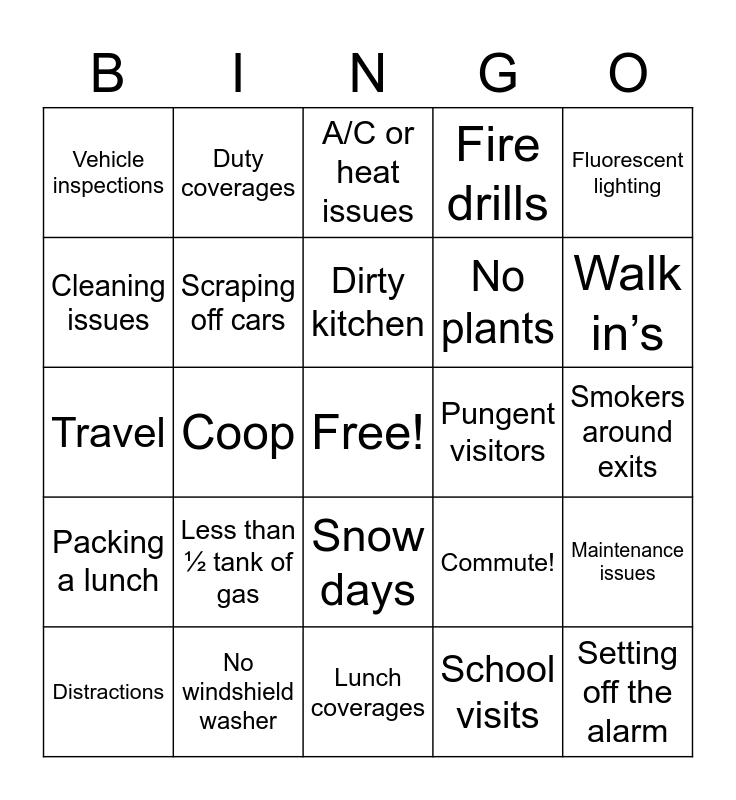 This bingo card has a free space and 36 words: Pants with zippers, No pj’s, Door alarms, Scraping off cars, Commute!, Packing a lunch, Dirty kitchen, No windows, Fluorescent lighting, Jammed fax machines, Coop, Fire drills, No nap breaks, Pungent visitors, Walk in’s, Vehicle inspections, Dirty cars, Less than ½ tank of gas, Setting off the alarm, A/C or heat issues, Smokers around exits, Maintenance issues, No windshield washer, Distractions, Lunch coverages, Duty coverages, Travel, Office ghost, No plants, Cleaning issues, Loud visitors, Unexpected visitors, School visits, Snow days, Forgetting to lock the washroom and No soap/dishsoap.