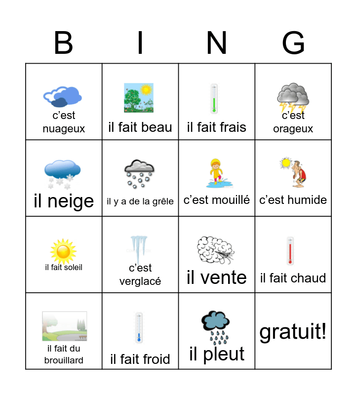 This bingo card has 15 images and 16 words: il fait froid, il fait chaud, il fait frais, c’est nuageux, il fait soleil, il fait beau, il vente, il pleut, il neige, il y a de la grêle, il fait du brouillard, c’est orageux, c’est verglacé, c’est humide, c’est mouillé and gratuit!.