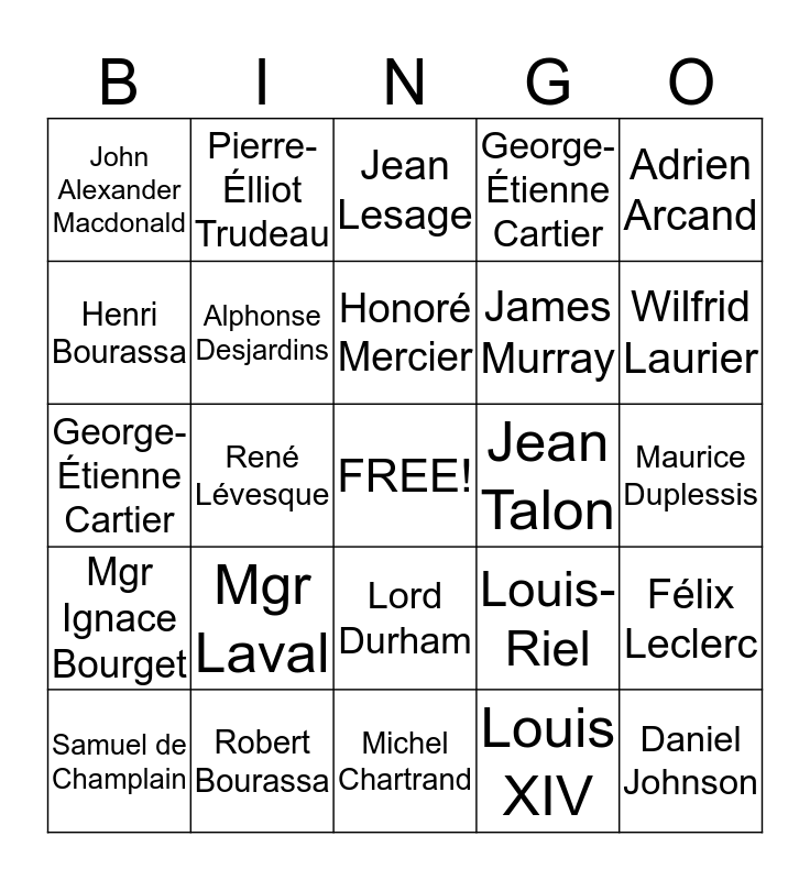 This bingo card has a free space and 24 words: Mgr Laval, Robert Bourassa, Honoré Mercier, Samuel de Champlain, Adrien Arcand, John Alexander Macdonald, Henri Bourassa, Pierre-Élliot Trudeau, Jean Talon, Lord Durham, James Murray, George-Étienne Cartier, Louis-Riel, Félix Leclerc, Alphonse Desjardins, Louis XIV, Maurice Duplessis, Jean Lesage, Wilfrid Laurier, René Lévesque, Daniel Johnson, Mgr Ignace Bourget, George-Étienne Cartier and Michel Chartrand.