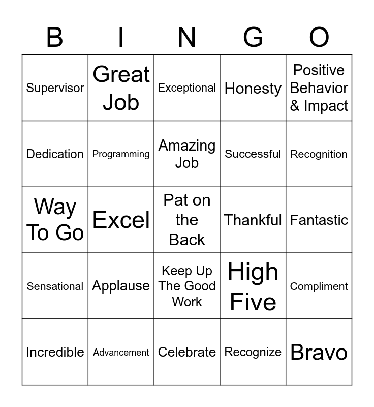 This bingo card has a free space and 138 words: Free!, Thanks, Appreciate, Grateful, Gratitude, Thankful, Thank You, Appreciative, Applause, Recognize, Recognition, Kudos, Great Work, Amazing Job, High Five, Bravo, Fantastic, Teamwork, Commendation, Bravo, Dedication, Compliment, Celebrate, Awesome, Kudos, Applause, Dedication, Appreciative, Appreciate, Grateful, Bravo, Compliment, Thanks, Recognize, Super, Fantastic, Amazing, Extraordinary, Impressive, Magnificent, Incredible, Marvelous, Spectacular, Fabulous, Stupendous, Exceptional, Phenomenal, Applause, Awesome, Accountability, Remarkable, Sensational, Appreciative, Believe in Your Ability, Can Do Attitude, Amazing Job, Achievement, Champion, Commendation, Beneficial, Above& Beyond, Advancement, Compliment, Continually Improve, Committed, Capable, Celebrate, Excellence, Dedication, Deliver, Communication, Community, Fantastic, Dignity, Empowerment, Dependable, Enthusiastic, Going Places, Excel, Exceptional, Encouraging, Fabulous, Helpful, Great Job, Focused, Extraordinary, Hats Off, Impressive, High Five, Greatness, Friendly, Job Well Done, Joy, Incredible, Honesty, Growth, Marvelous, Optimistic, Keep Up The Good Work, Innovative, Hooray, Opportunities, Positive Behavior & Impact, Never Give Up, On Time, Integrity, Phenomenal, Punctual, Organized, Partnership, Magnificent, Programming, Remarkable, Proactive, Sensational, Persevere, Recognition, So Proud Of You, Purchasing, Supportive, Professional& Courteous, Smart, Superb, Respectable, Way To Go, Stupendous, Successful, Valuable, Spectacular, You're The Best, Team Players, Teamwork, You Rock, Supervisor, Wonderful, Worthy, Visionary and You're On Your Way.